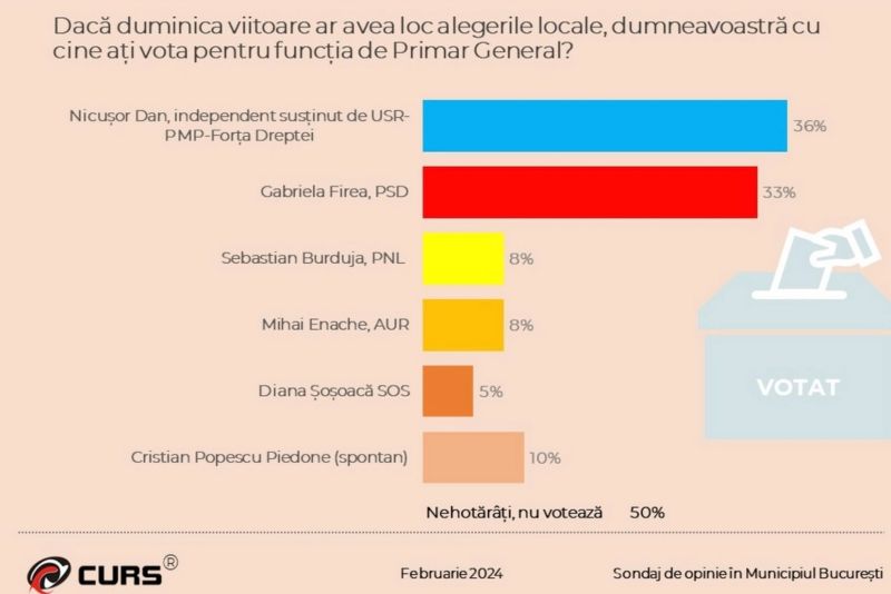 Candidatul PNL Sebastian Burduja este creditat cu 8% în intențiile de vot, la egalitate acu Marian Enache de la AUR. Diana Șoșoacă a fost indicată de 5% dintre cei care au răspuns la sondaj.