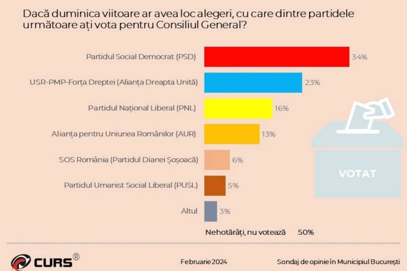 Sondajul CURS a fost efectuat în București, față în față, în perioada 9-23 februarie, pe un eșantion de 1.067 respondenţi în vârstă de 18 ani şi peste, iar marja de eroare este plus/minus 3% la un nivel de încredere la 95%.