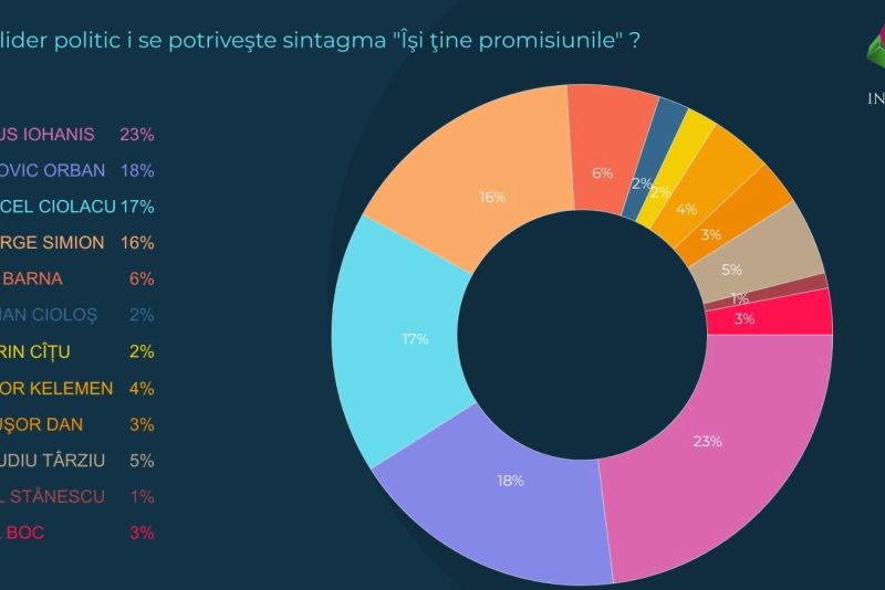 La întrebarea "Cărui lider politic i se potrivește sintagma "Își ține promisiunile"?", românii chestionați au răspuns: Klaus Iohannis - 23%, Ludovic Orban - 18%, Marcel Ciolacu - 17%. La polul opus, se află Dan Barna, cu 6%, Nicușor Dan, cu 3%, și Florin Cîțu, cu 2%.