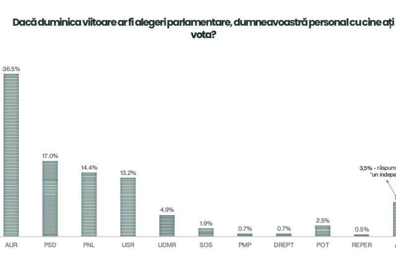 Întrebați pe cine ar vota dacă duminica viitoare ar fi alegeri parlamentare, românii au indicat, într-un procent covârșitor, Alianța pentru Unirea Românilor: 36,5% dintre cei intervievați ar pune ștampila pe formațiune. La mare distanță se află partidele din coaliția de guvernare.