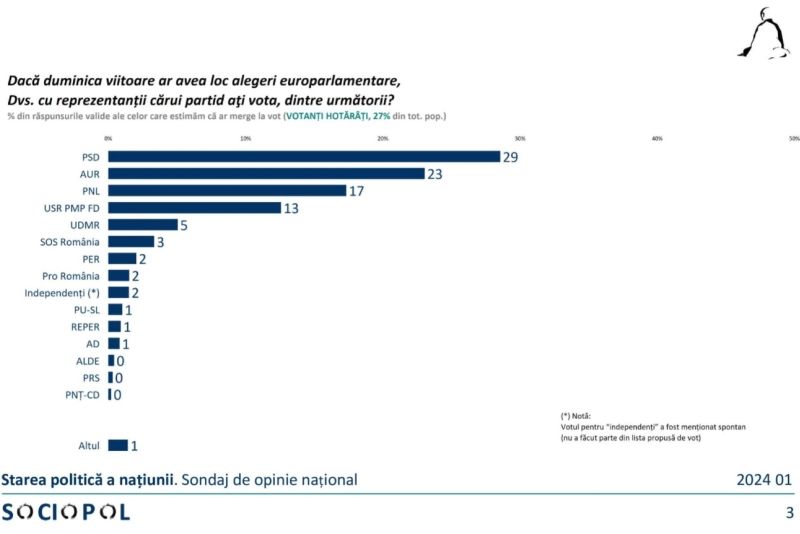 Potrivit sondajului, PSD este creditat cu 29%, în timp ce AUR s-ar situa pe locul 2, la o distanță de doar 6 procente (23%). PNL (17%) se situează pe locul 3 în preferințele românilor pentru europarlamentare, în timp ce alianța formată din USR, PMP și Forța Dreptei ar primi 13% dintre voturi.