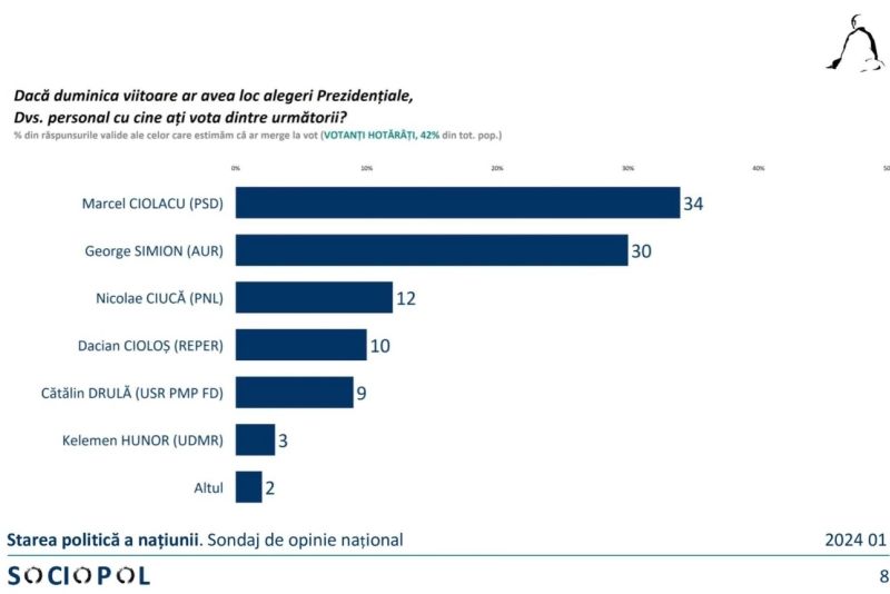 În ceea ce privește candidații pentru alegerile prezidențiale, românii își îndreaptă opțiunile spre liderul PSD, Marcel Ciolacu, care ar fi votat de 34% dintre aceștia.