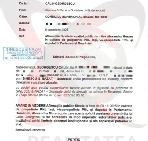 Călin Georgescu a depus petiții la Consiliul Superior al Magistraturii, după ce Alexandru Muraru a sesizat Parchetul și a cerut arestarea sa. Fostul candidat interzis la prezidențiale a depus o petiție și împotriva președintelui Nicușor Dan, pentru că a intervenit în justiție.