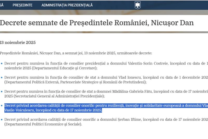 Potrivit decretului publicat pe pagina oficială a președinției, lui Vlad Vasile Voiculescu i se acordă calitatea de "consilier onorific pentru reziliență, inovație și solidaritate europeană a domnului Vlad Vasile-Voiculescu, începând cu data de 17 noiembrie 2025".