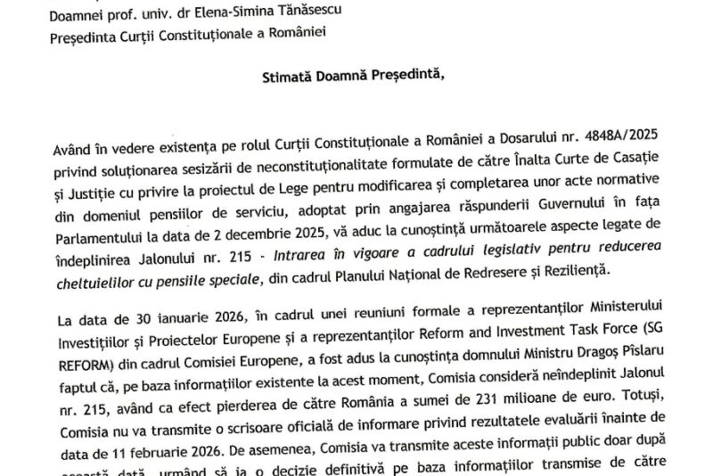 În document, premierul avertizează că, potrivit discuțiilor oficiale dintre Ministerul Investițiilor și Proiectelor Europene și reprezentanții Comisiei Europene, „Comisia consideră neîndeplinit Jalonul nr. 215, având ca efect pierderea de către România a sumei de 231 milioane de euro”. Mai mult, Executivul notează că Bruxelles-ul nu va comunica public această concluzie înainte de 11 februarie 2026, dar decizia finală va depinde de informațiile transmise de autoritățile române. Premierul subliniază astfel presiunea temporală și instituțională asupra CCR, într-un moment în care reforma pensiilor speciale se află în centrul unei dispute majore între Guvern, sistemul judiciar și Comisia Europeană.